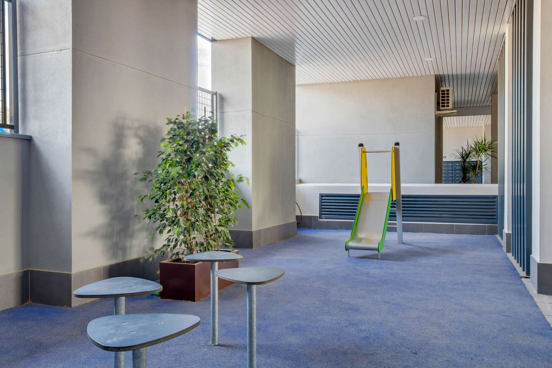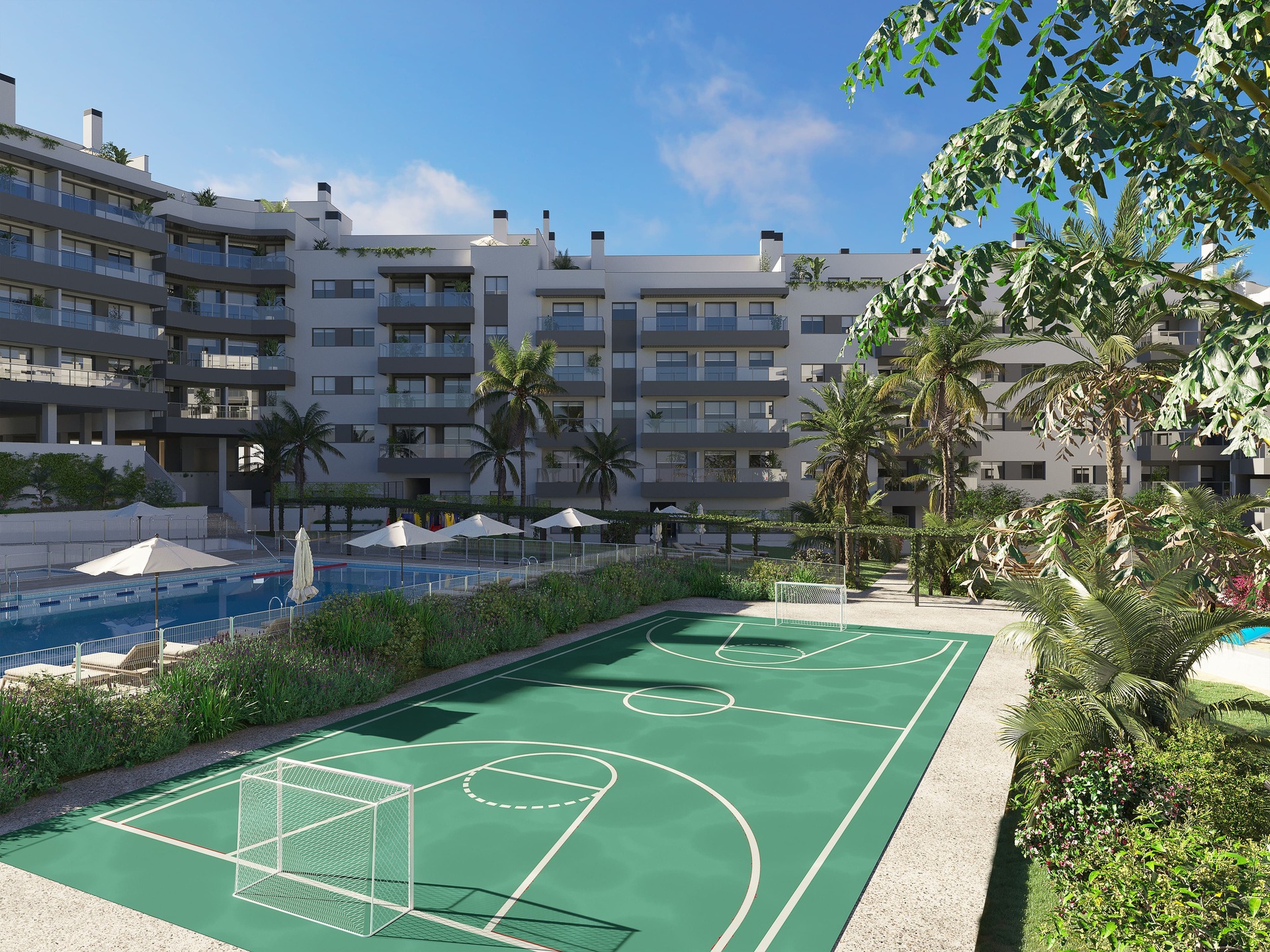 The complex is surrounded by extensive landscaped gardens, designed to create an atmosphere of tranquillity and enjoyment all year round. Outdoor facilities include a communal swimming pool, perfect for cooling off on hot days, and a play area for children. In addition, there are dedicated areas for outdoor sports, allowing residents to maintain an active and healthy lifestyle without leaving the development. The covered and uncovered communal areas have been carefully planned to provide an ideal space for socialising and wellbeing.