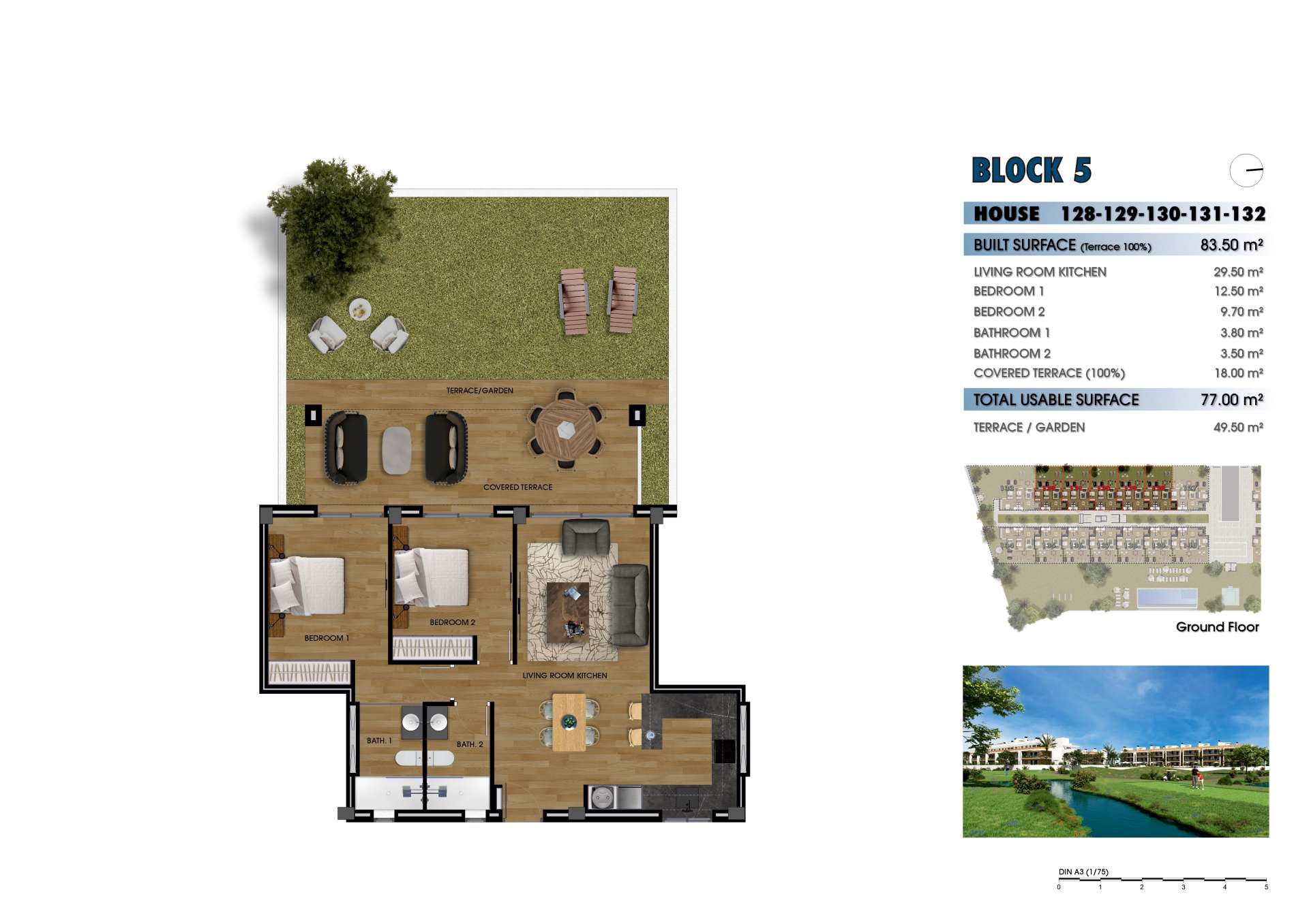 The interiors of the flats in the residential complex near La Serena Golf are designed to maximise comfort and functionality. The ground floor flats offer direct access to the private gardens, while those on the first floor feature terraces and solariums that extend the outdoor living space. Each flat includes a modern kitchen, spacious living rooms and bedrooms, as well as two fully equipped bathrooms. The top floor corner flats have three bedrooms, offering more space and comfort for families. All flats are equipped with high quality finishes and pre-installation for air conditioning.
