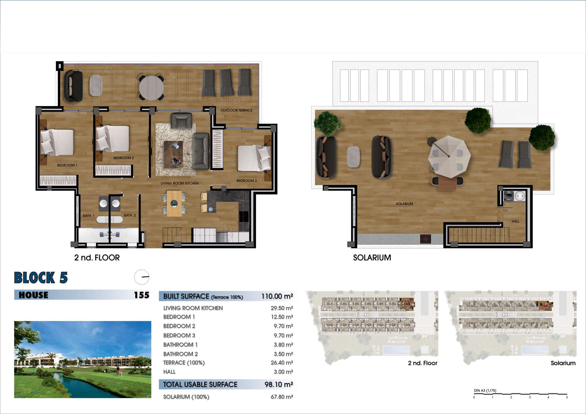 The interiors of the flats in the residential complex near La Serena Golf are designed to maximise comfort and functionality. The ground floor flats offer direct access to the private gardens, while those on the first floor feature terraces and solariums that extend the outdoor living space. Each flat includes a modern kitchen, spacious living rooms and bedrooms, as well as two fully equipped bathrooms. The top floor corner flats have three bedrooms, offering more space and comfort for families. All flats are equipped with high quality finishes and pre-installation for air conditioning.