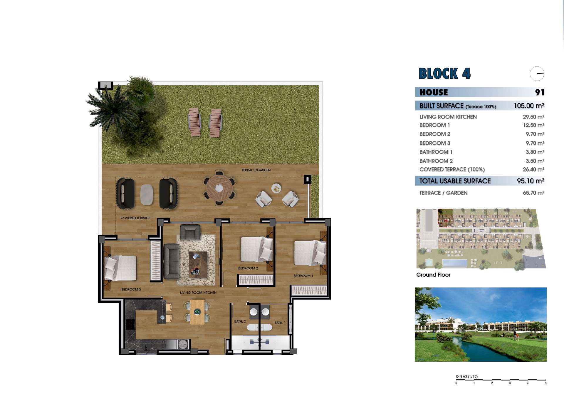 The interiors of the flats in the residential complex near La Serena Golf are designed to maximise comfort and functionality. The ground floor flats offer direct access to the private gardens, while those on the first floor feature terraces and solariums that extend the outdoor living space. Each flat includes a modern kitchen, spacious living rooms and bedrooms, as well as two fully equipped bathrooms. The top floor corner flats have three bedrooms, offering more space and comfort for families. All flats are equipped with high quality finishes and pre-installation for air conditioning.