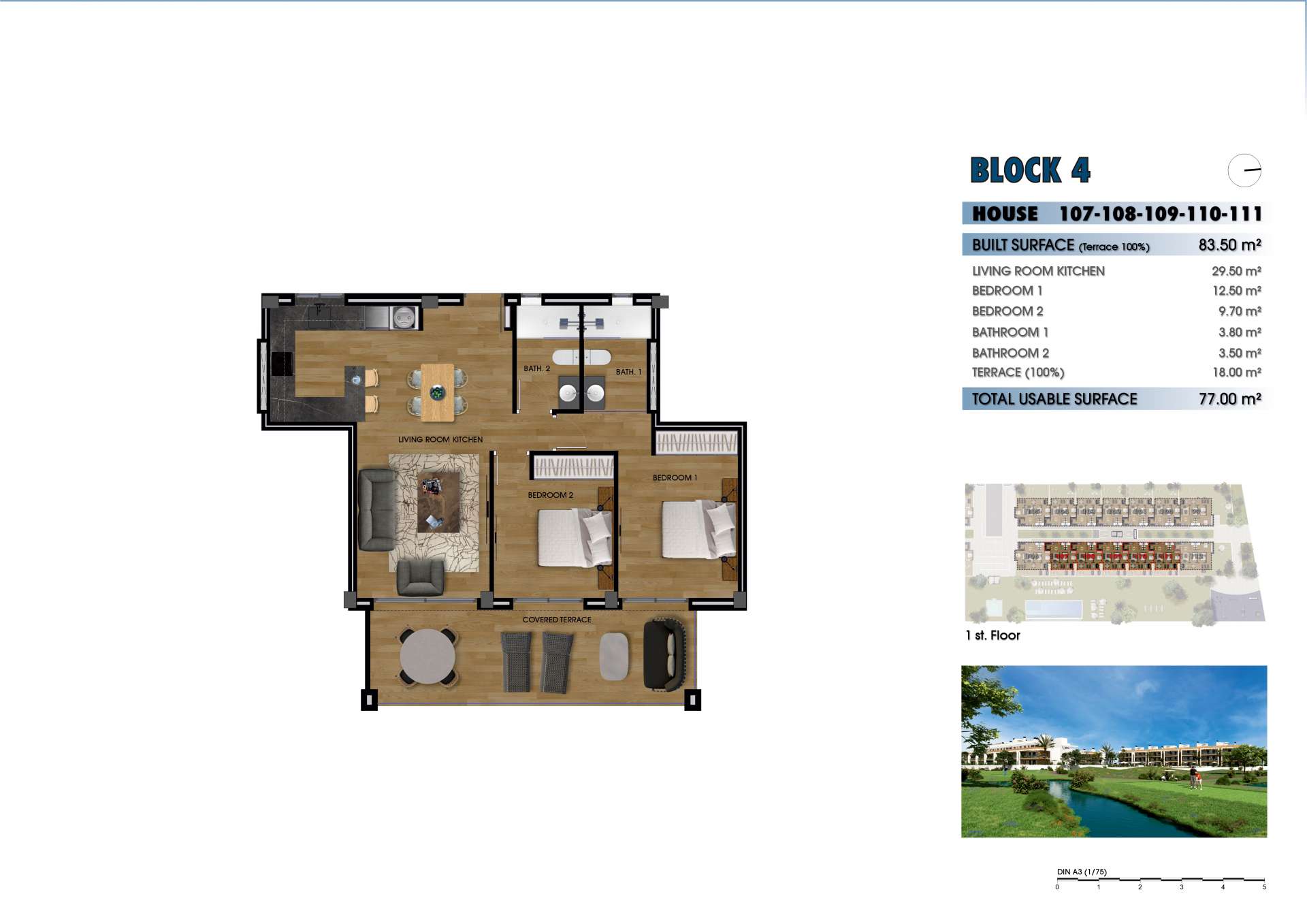The interiors of the flats in the residential complex near La Serena Golf are designed to maximise comfort and functionality. The ground floor flats offer direct access to the private gardens, while those on the first floor feature terraces and solariums that extend the outdoor living space. Each flat includes a modern kitchen, spacious living rooms and bedrooms, as well as two fully equipped bathrooms. The top floor corner flats have three bedrooms, offering more space and comfort for families. All flats are equipped with high quality finishes and pre-installation for air conditioning.