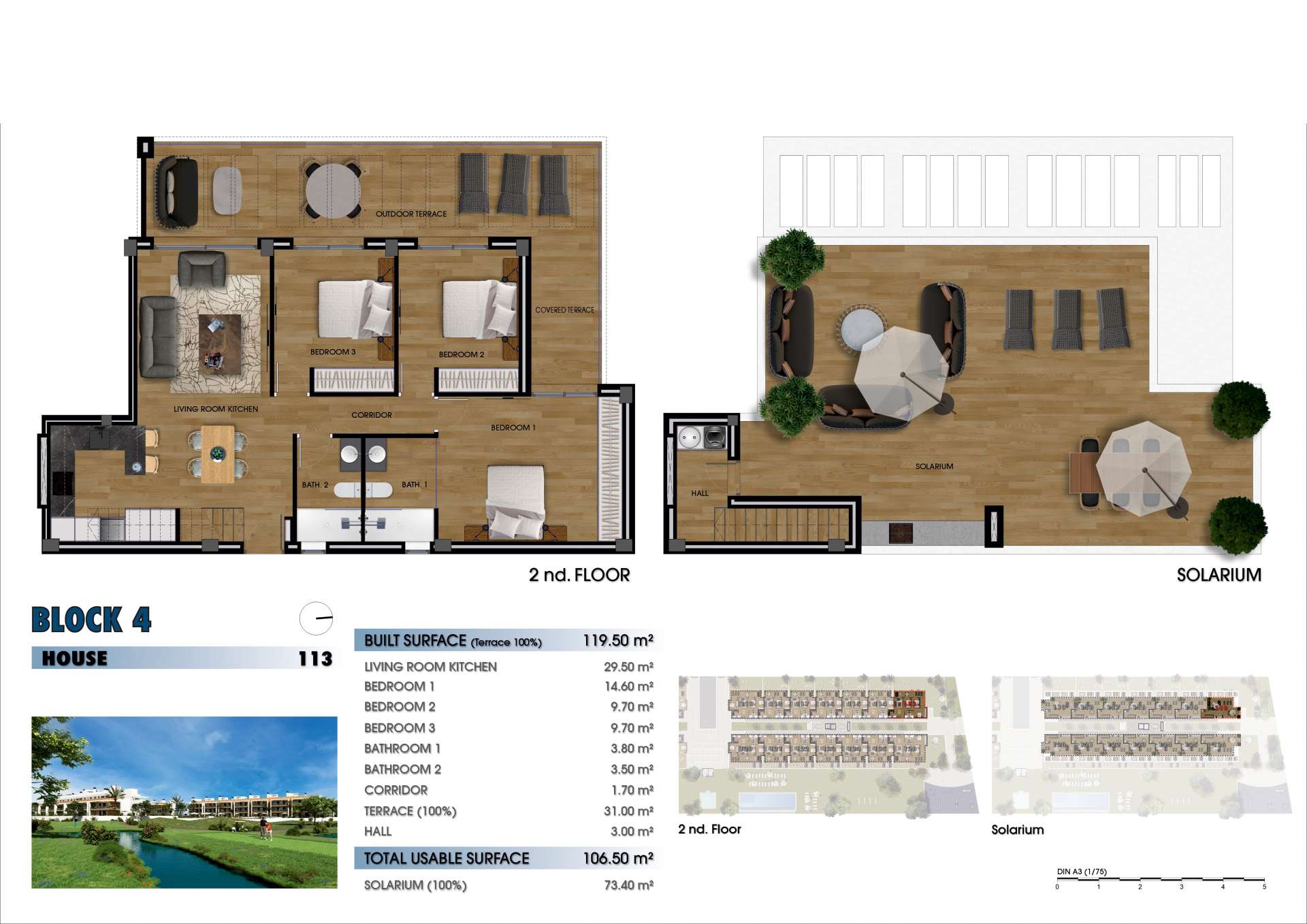 The interiors of the flats in the residential complex near La Serena Golf are designed to maximise comfort and functionality. The ground floor flats offer direct access to the private gardens, while those on the first floor feature terraces and solariums that extend the outdoor living space. Each flat includes a modern kitchen, spacious living rooms and bedrooms, as well as two fully equipped bathrooms. The top floor corner flats have three bedrooms, offering more space and comfort for families. All flats are equipped with high quality finishes and pre-installation for air conditioning.