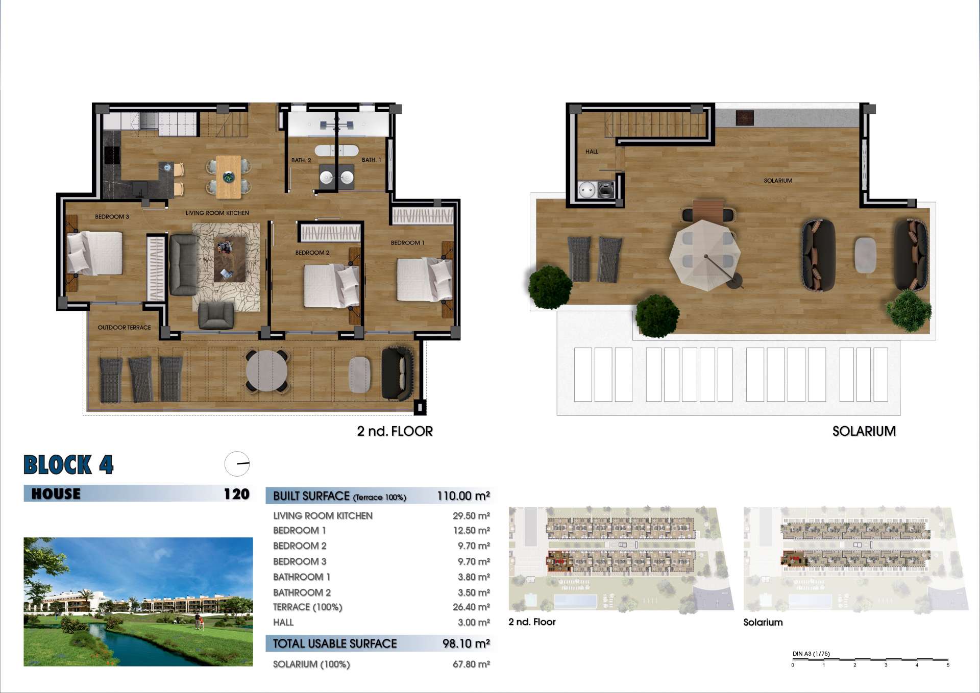 The interiors of the flats in the residential complex near La Serena Golf are designed to maximise comfort and functionality. The ground floor flats offer direct access to the private gardens, while those on the first floor feature terraces and solariums that extend the outdoor living space. Each flat includes a modern kitchen, spacious living rooms and bedrooms, as well as two fully equipped bathrooms. The top floor corner flats have three bedrooms, offering more space and comfort for families. All flats are equipped with high quality finishes and pre-installation for air conditioning.