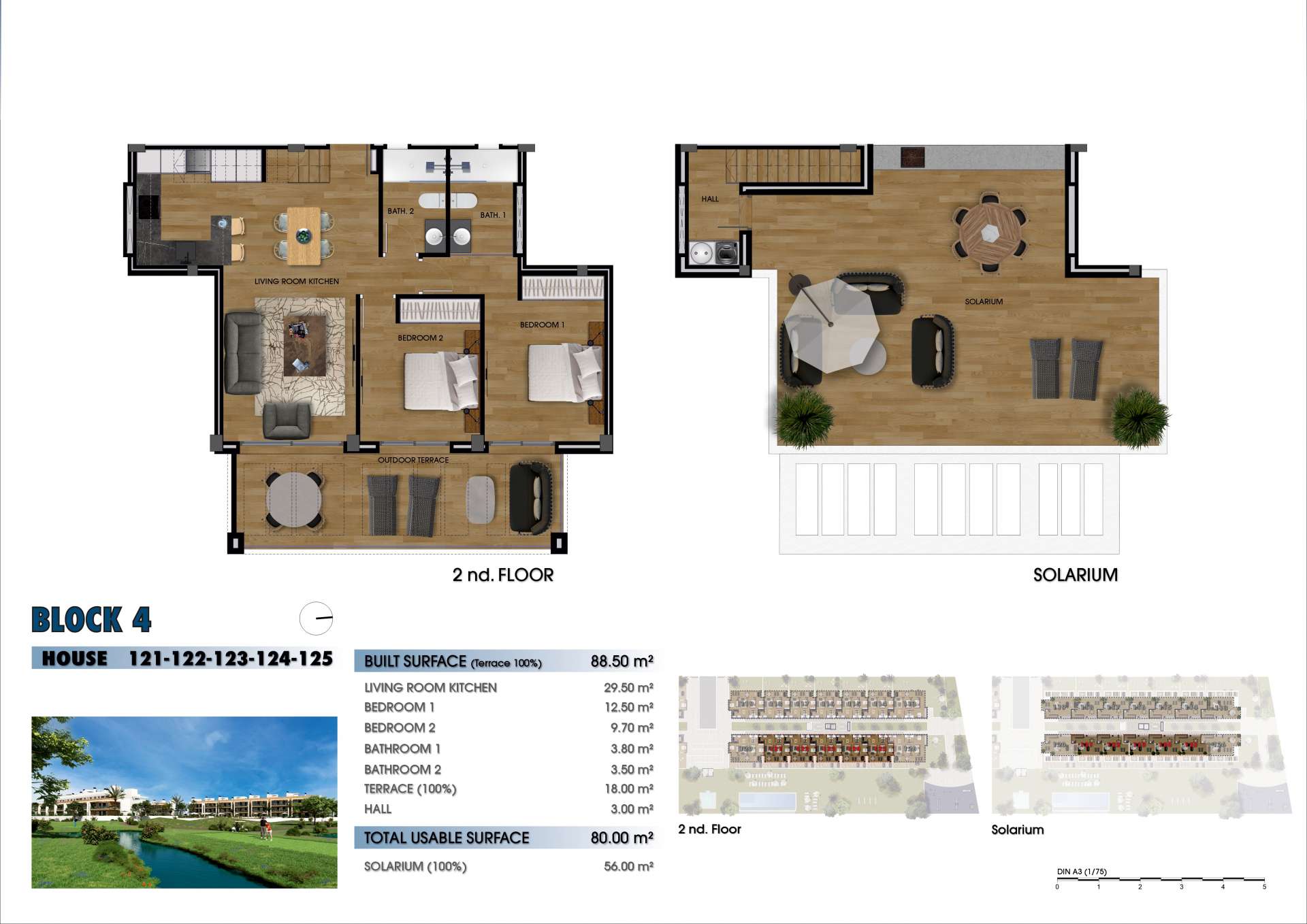 The interiors of the flats in the residential complex near La Serena Golf are designed to maximise comfort and functionality. The ground floor flats offer direct access to the private gardens, while those on the first floor feature terraces and solariums that extend the outdoor living space. Each flat includes a modern kitchen, spacious living rooms and bedrooms, as well as two fully equipped bathrooms. The top floor corner flats have three bedrooms, offering more space and comfort for families. All flats are equipped with high quality finishes and pre-installation for air conditioning.