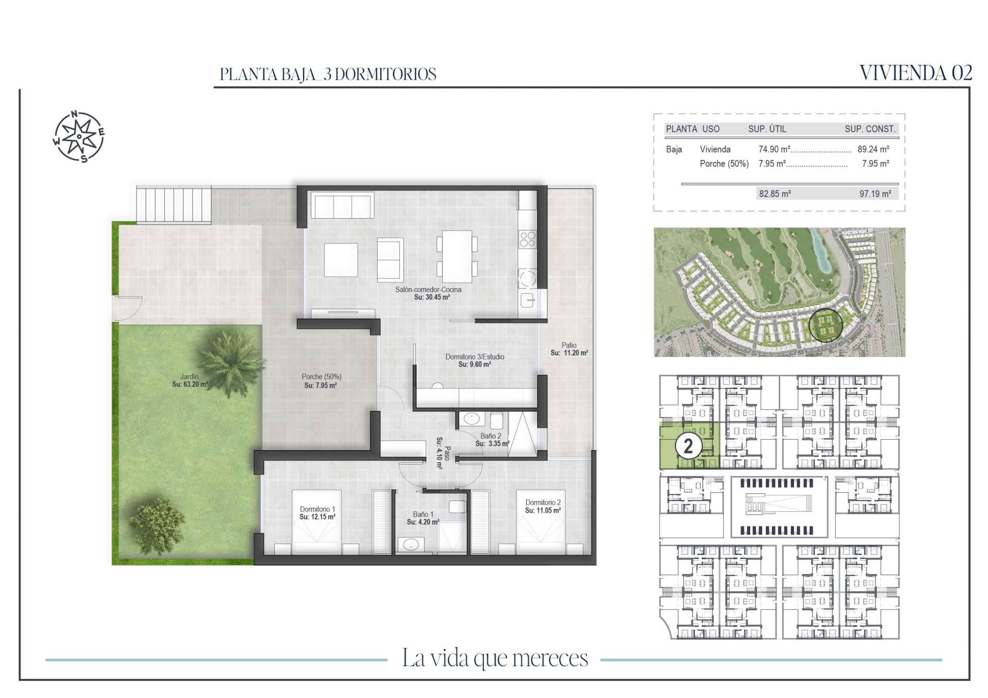 The development is integrated in a unique environment, where the views of the golf course and the mountains are the protagonists. The landscaped areas combine Mediterranean and tropical species, creating green spaces that invite you to relax. The ground floor bungalows have a front garden and backyard, and some also include a private parking space inside the plot. The top floor properties have a large porch and a private solarium with outdoor kitchen, perfect for relaxing or sharing moments outdoors.