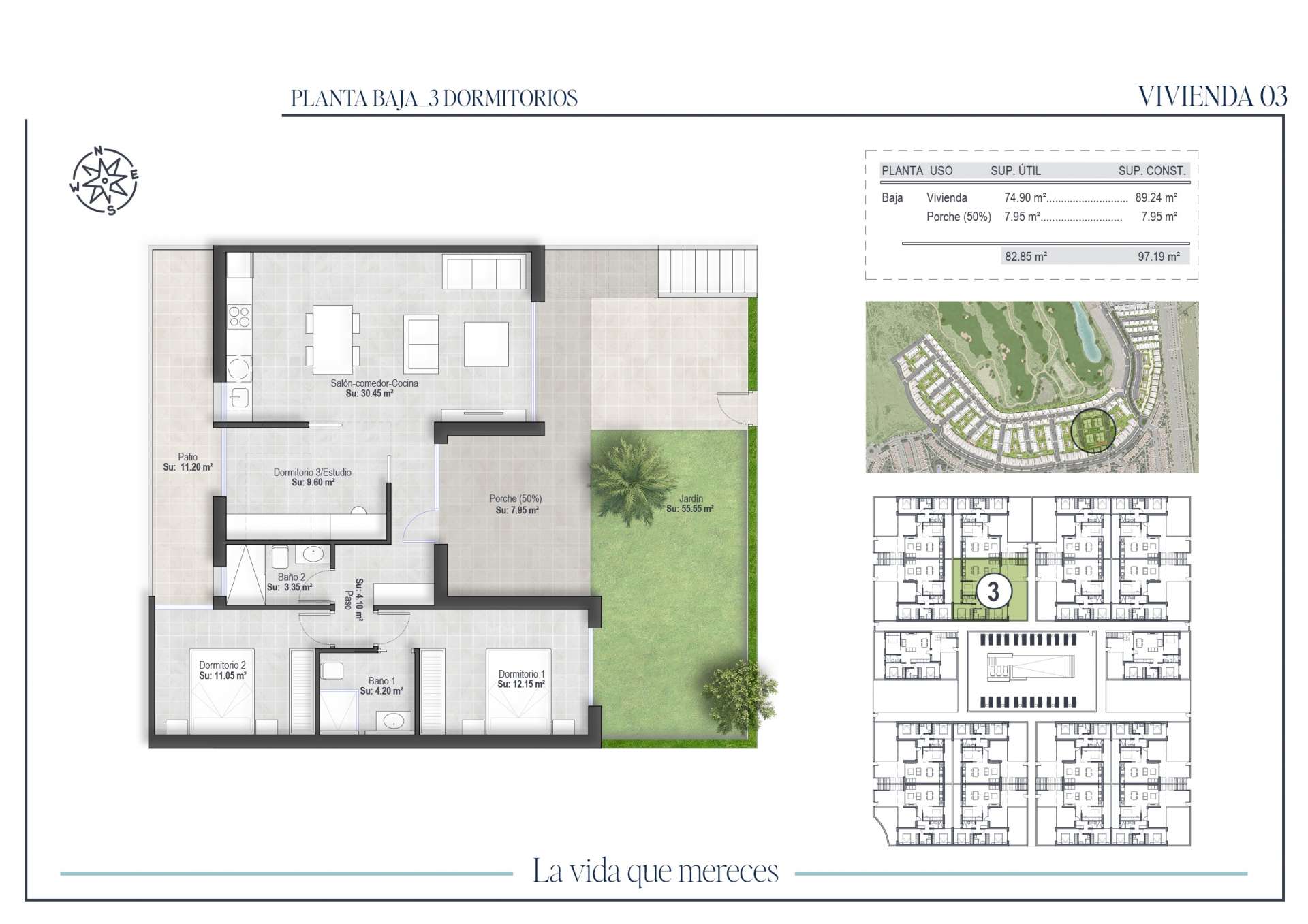 The development is integrated in a unique environment, where the views of the golf course and the mountains are the protagonists. The landscaped areas combine Mediterranean and tropical species, creating green spaces that invite you to relax. The ground floor bungalows have a front garden and backyard, and some also include a private parking space inside the plot. The top floor properties have a large porch and a private solarium with outdoor kitchen, perfect for relaxing or sharing moments outdoors.