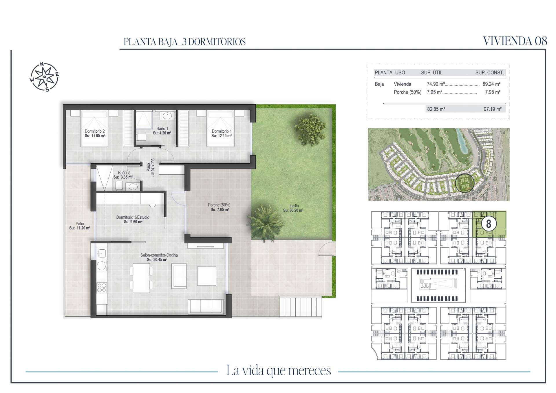 The development is integrated in a unique environment, where the views of the golf course and the mountains are the protagonists. The landscaped areas combine Mediterranean and tropical species, creating green spaces that invite you to relax. The ground floor bungalows have a front garden and backyard, and some also include a private parking space inside the plot. The top floor properties have a large porch and a private solarium with outdoor kitchen, perfect for relaxing or sharing moments outdoors.