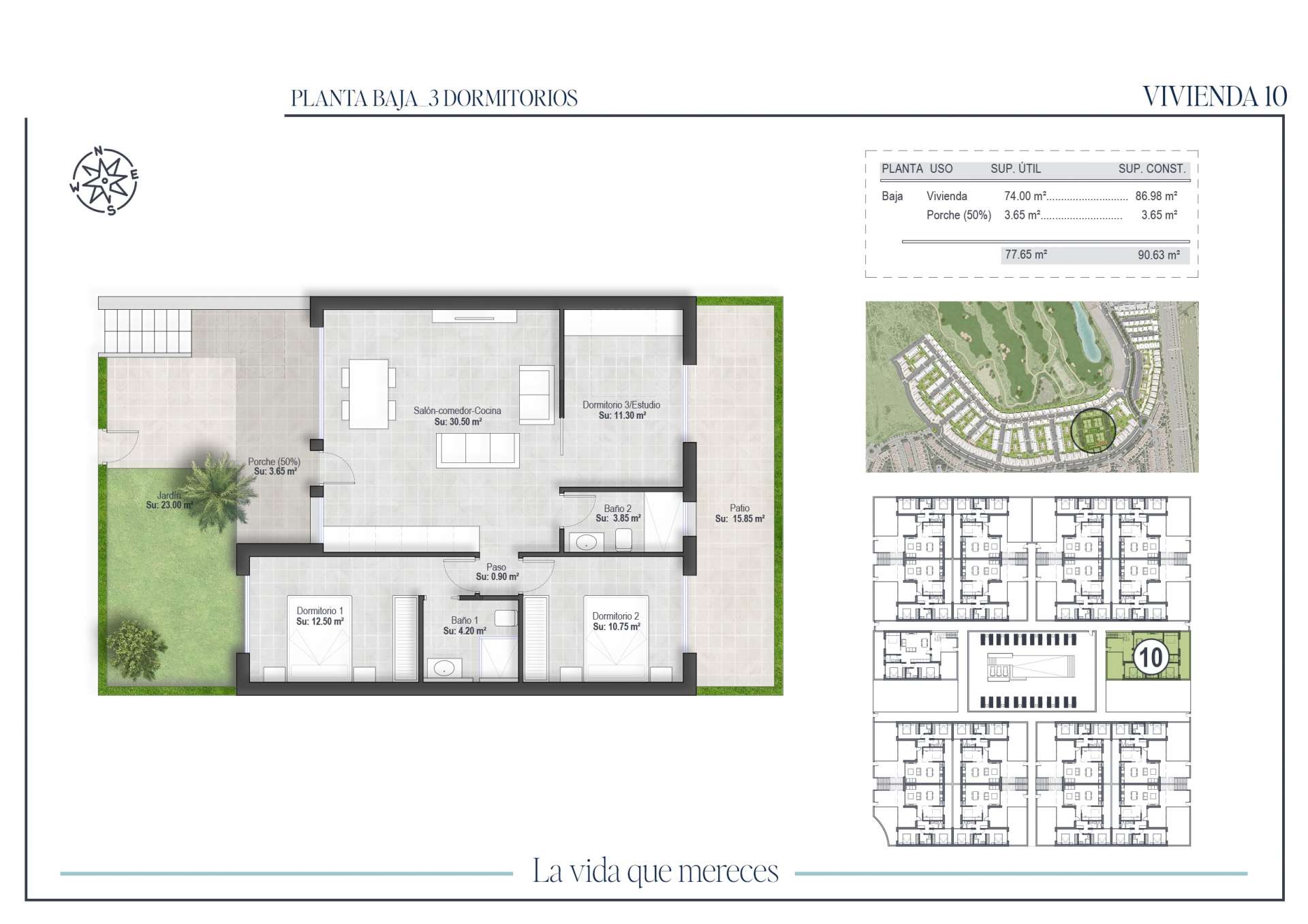 The development is integrated in a unique environment, where the views of the golf course and the mountains are the protagonists. The landscaped areas combine Mediterranean and tropical species, creating green spaces that invite you to relax. The ground floor bungalows have a front garden and backyard, and some also include a private parking space inside the plot. The top floor properties have a large porch and a private solarium with outdoor kitchen, perfect for relaxing or sharing moments outdoors.