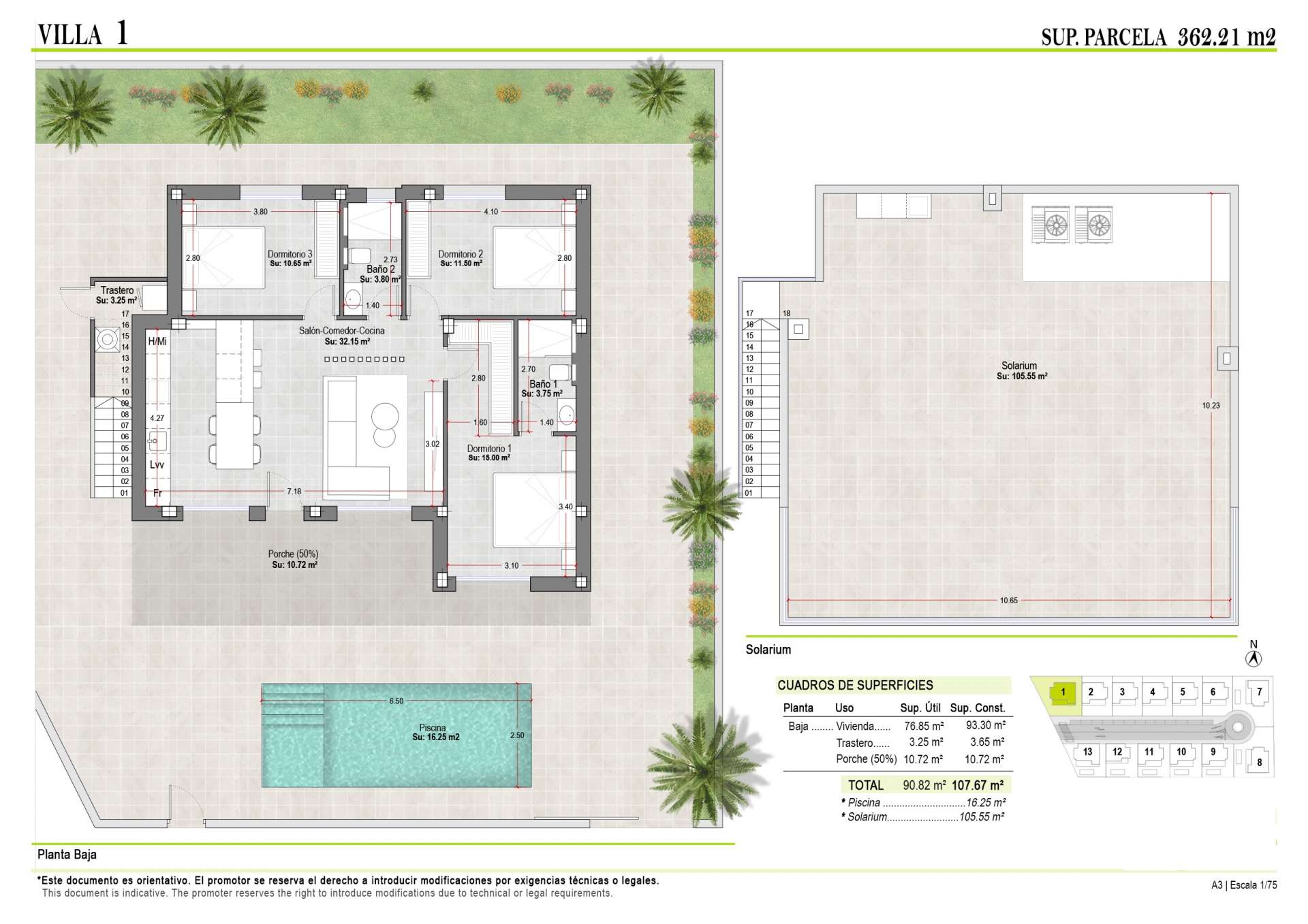 Each type of property has been designed with generous outdoor areas: Ground floor bungalows: private gardens ideal for enjoying with the family, with direct access to the communal areas. First floor bungalows: spacious private solariums with unobstructed views. Detached villas: large south-facing terraces, private pool, garden, summer kitchen and solarium. Apartments: terraces with outdoor kitchen on all floors, gardens on the ground floor and solarium on the top floor. All homes have a private outdoor parking space and some models include storage space and charging points for electric vehicles.