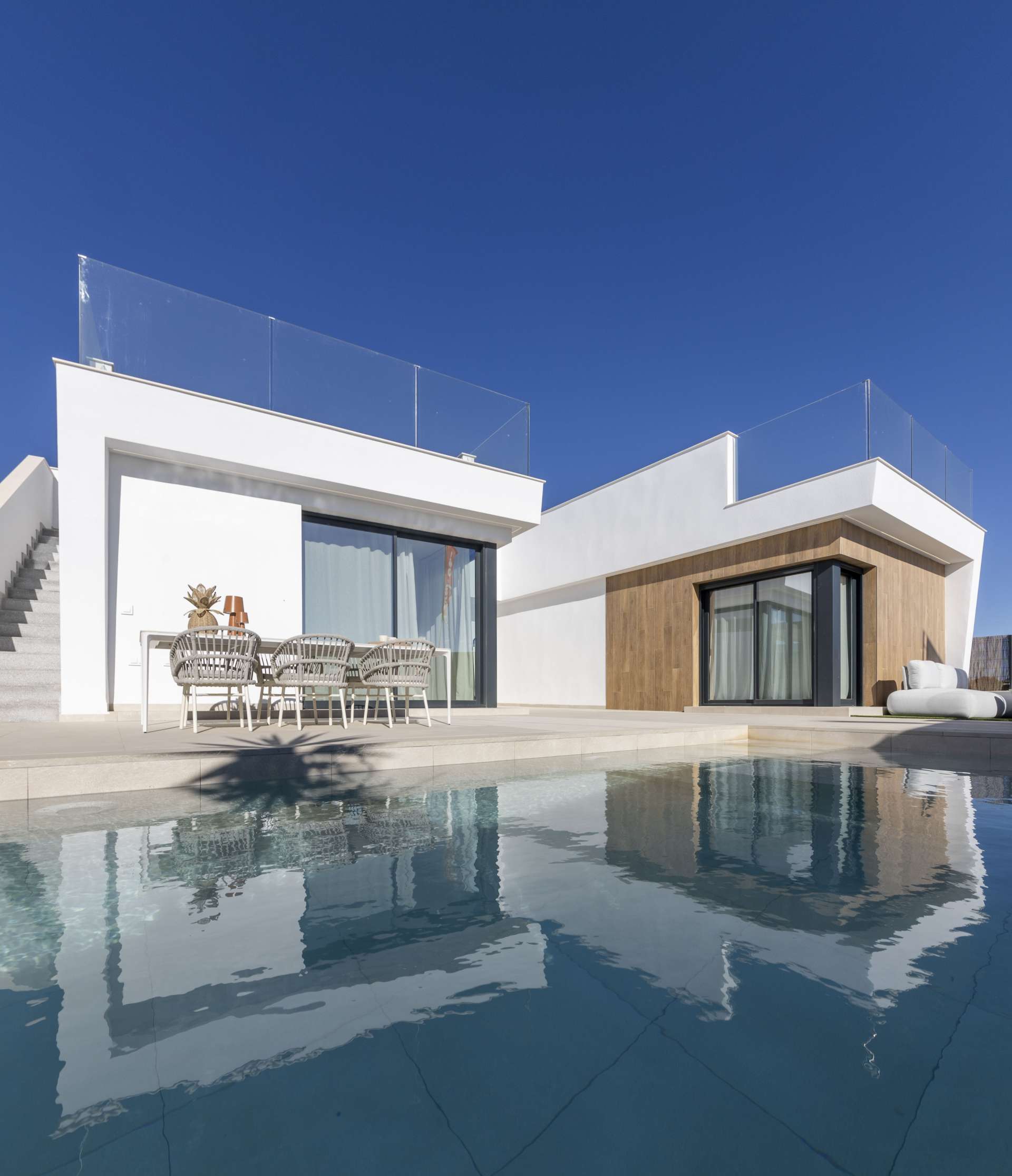 Property Description This exclusive residential development has plots from 300 m2. Only 15 minutes drive from the centre of Murcia city, you can enjoy the tranquillity and security offered by the Golf Course and the convenience of living close to all services. What do we get living in such an environment? The possibility of living peacefully, in contact with nature and mountains. With everything you need within reach. Quality of life, fresh air, open spaces. And if we want to go for a swim? Just 15 minutes away you can enjoy a swim in the Mar Menor or 20 minutes and enjoy the beaches of the Mediterranean in San Pedro del Pinatar. The new development has several types of villas, with 2, 3 and 4 bedrooms on the ground floor, 2 bathrooms and private pool with multiple options where quality is our top priority and where we integrate the exterior with the interior of the house.
