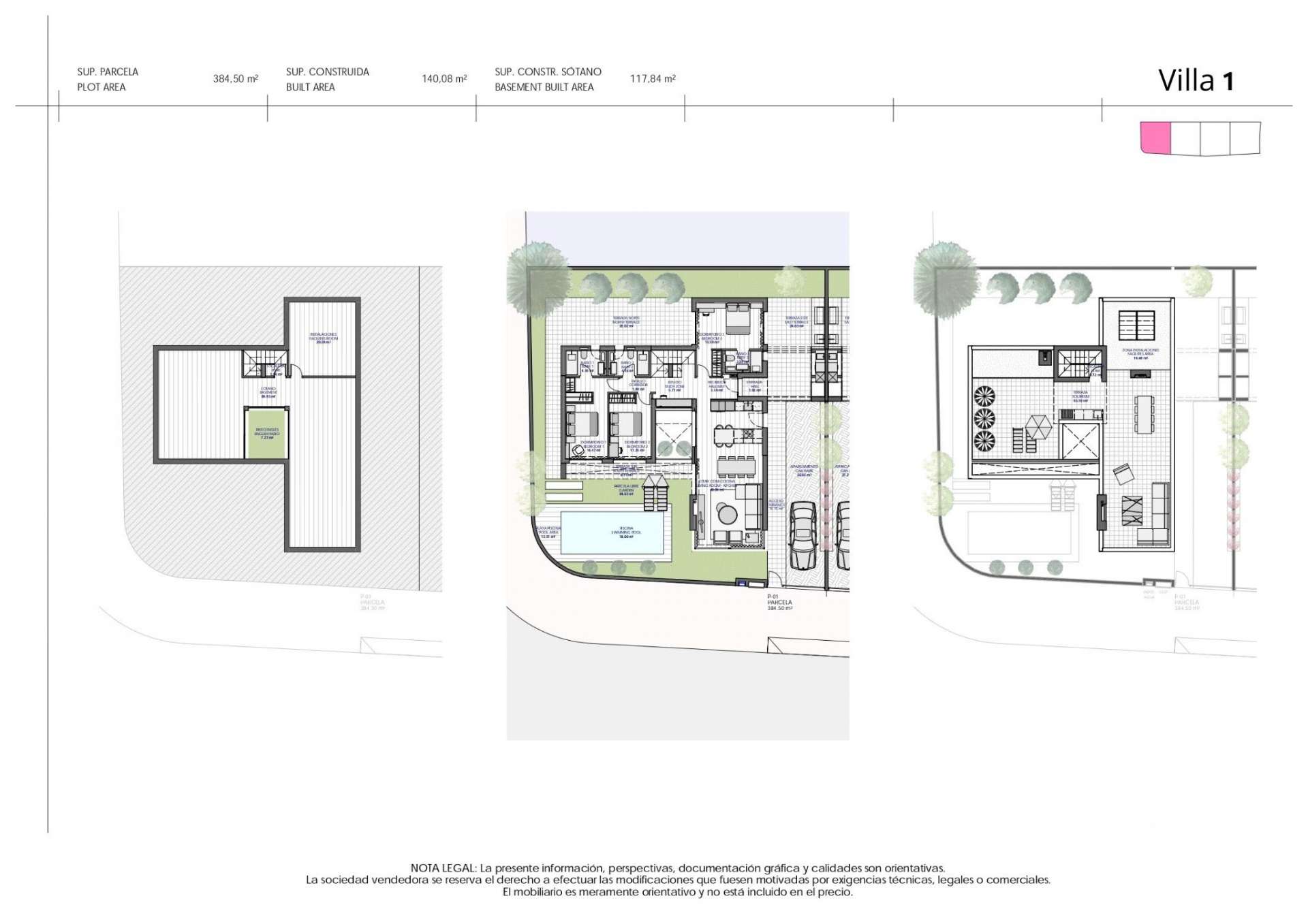 We present an exclusive development of new villas in a private gated complex in the region of Murcia. These detached villas are designed to offer maximum comfort and luxury, surrounded by excellent golf courses and located just 10 minutes from the sandy beaches of the Mar Menor. The project consists of 4 villas with 3 bedrooms and 3 bathrooms, built on a single floor, with a private swimming pool, open plan basement with light and ventilation through an English patio, and a large solarium. The villas are set on plots of approximately 400 m² and have fully fitted kitchens and bathrooms, as well as pre-installation for ducted air conditioning.