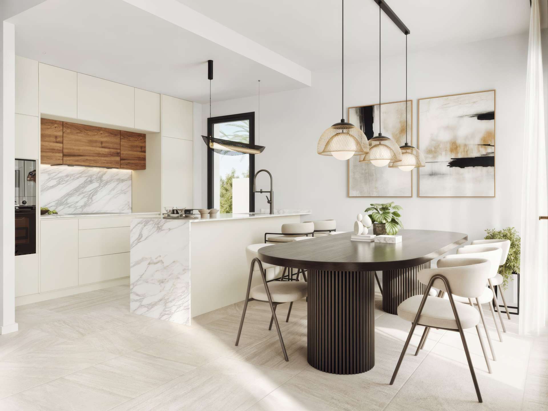 These properties have been built to high quality standards with a functional layout: 3 double bedrooms and 4 bathrooms Living-dining room with large windows and airtight sliding doors Kitchen equipped with BOSCH appliances Bathrooms with safety glass partitions and mirrors with LED lights PVC exterior carpentry with motorised blinds Efficient air conditioning and cross ventilation Basement with English courtyard providing natural light and ventilation The combination of noble materials, energy efficiency and modern design creates a welcoming, elegant and long-lasting atmosphere.
