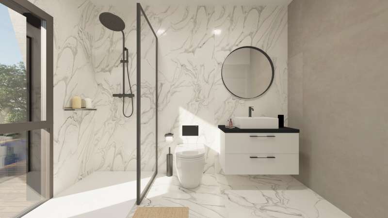 The interior of the flats is designed to offer maximum comfort and functionality. With a constructed area of 141 m² and a living area of 110 m², each flat has three double bedrooms, two full bathrooms and a toilet, all equipped with high quality finishes. The open-plan, fully equipped kitchen integrates seamlessly with the living room, creating an open and welcoming space ideal for everyday living and entertaining. Underfloor heating in the bathrooms provides additional comfort all year round. Built-in wardrobes in the bedrooms offer ample storage space, and the large windows let in natural light, creating a bright and welcoming atmosphere.