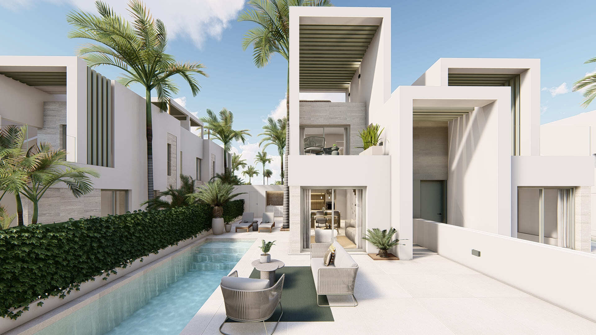 Les maisons combinent un design moderne avec des matériaux de haute qualité, tels que le béton blanc et la pierre, créant ainsi une esthétique sophistiquée et contemporaine. Les extérieurs sont conçus pour profiter au maximum du climat méditerranéen, avec des terrasses spacieuses qui permettent à la lumière naturelle de pénétrer tout au long de la journée. Les espaces verts complètent parfaitement le design, offrant une atmosphère fraîche et relaxante. En outre, chaque propriété dispose d'une piscine privée, idéale pour se rafraîchir pendant les chaudes journées d'été, et offre la possibilité d'ajouter un jacuzzi au solarium pour des moments uniques de détente en plein air.