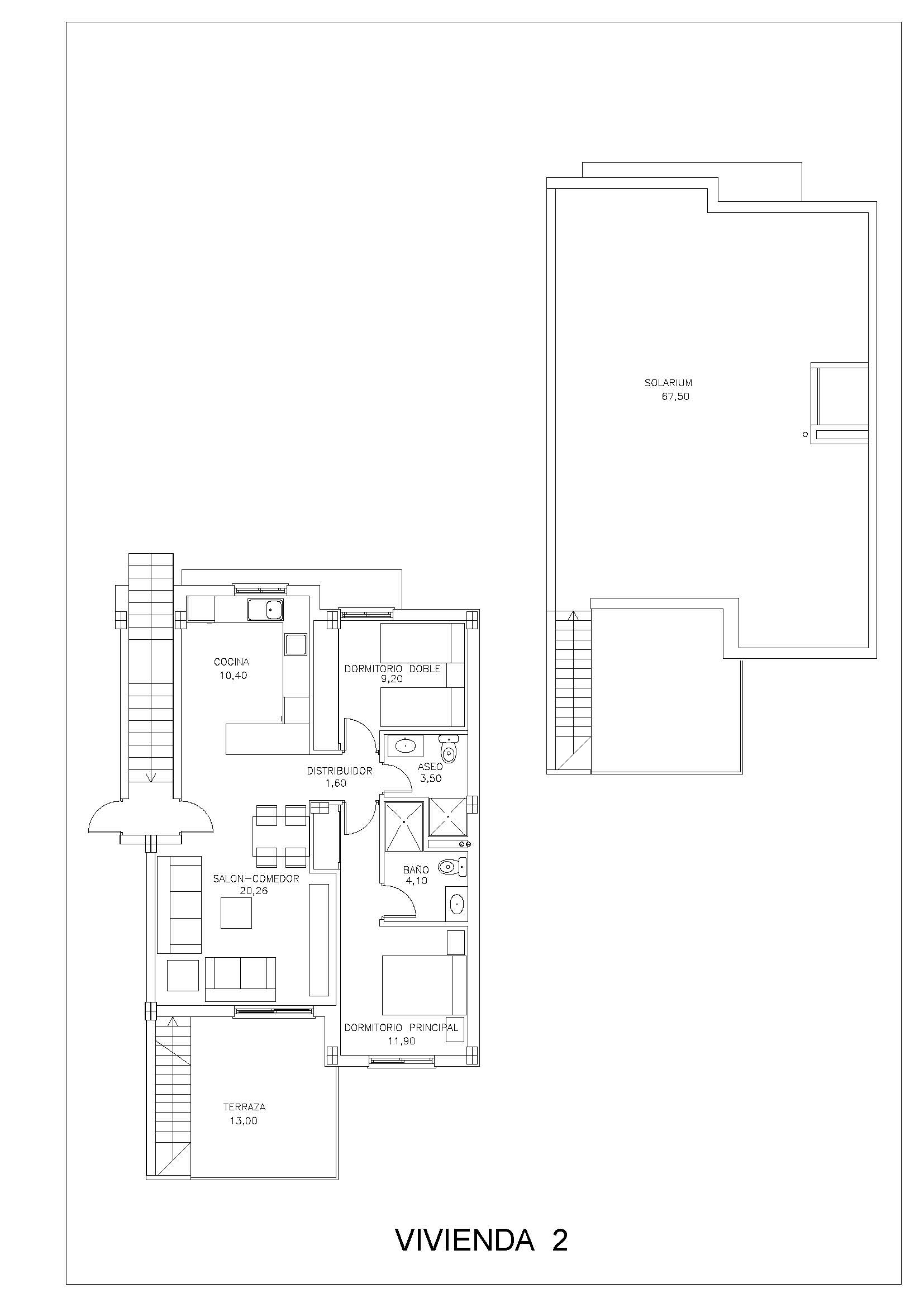 Les logements disposent de deux chambres et deux salles de bains, avec des dimensions spacieuses qui permettent d'agrandir à trois chambres si vous le souhaitez. La distribution et le design sont pensés pour offrir confort et fonctionnalité, dans un environnement lumineux et spacieux.
