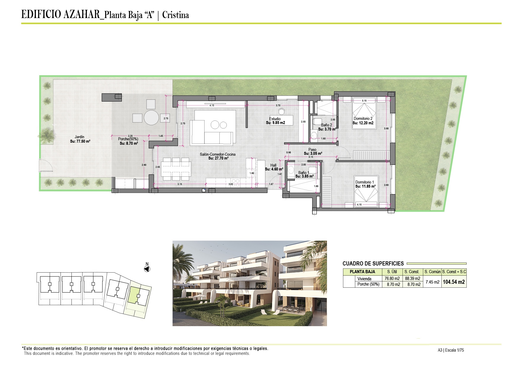 Flats: begane grond met 3 slaapkamers en 2 badkamers; de andere verdiepingen, met 2 slaapkamers en 2 badkamers, allemaal met functioneel ontwerp, goede oriëntatie en uitstekend gebruik van natuurlijk licht.