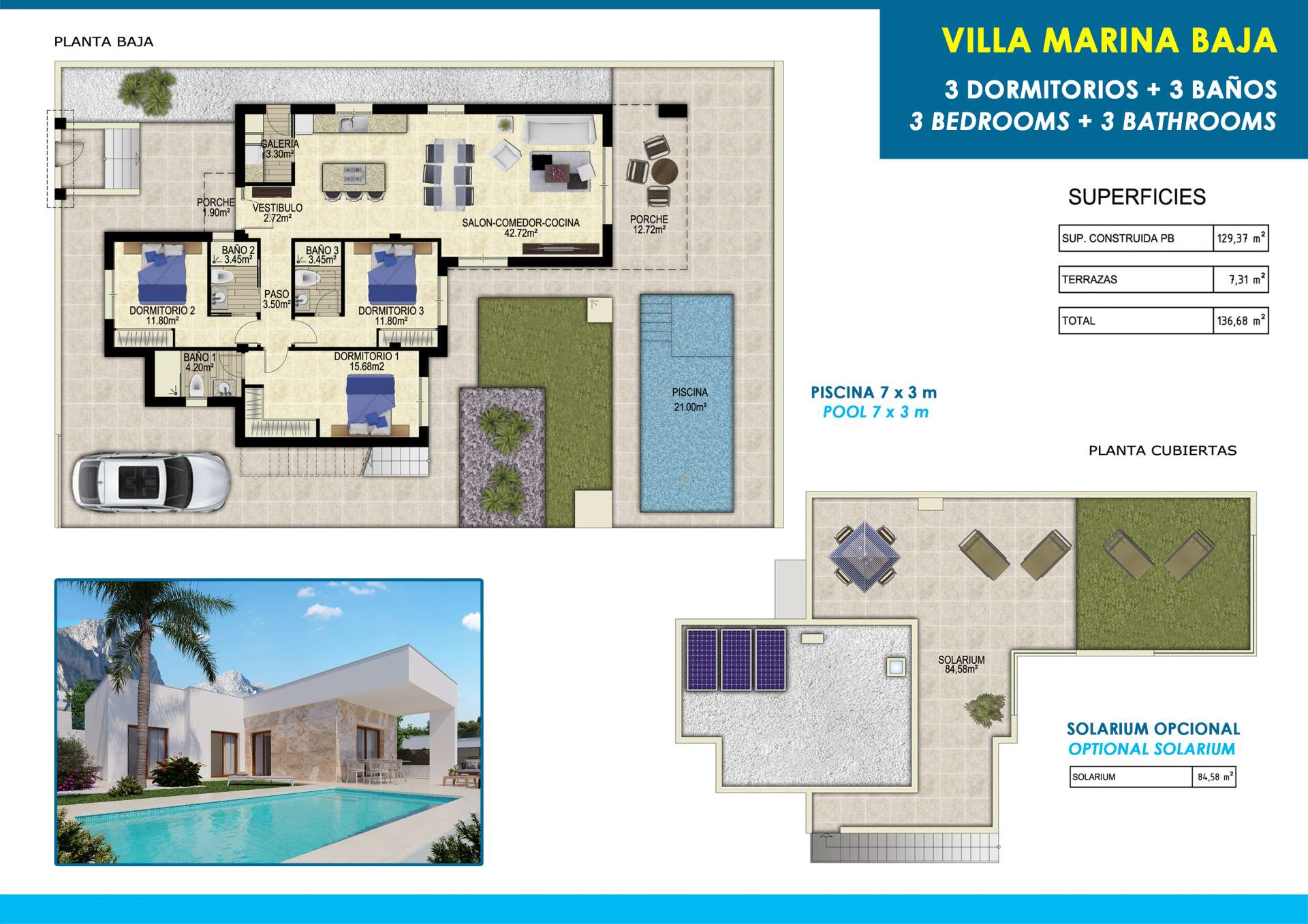 Beschrijving van het pand Dit nieuwe project ligt in een bevoorrechte enclave in de spectaculaire omgeving van Monte Ponoig en biedt 36 vrijstaande villa's met ruime percelen en panoramisch uitzicht op zee en de bergen. Het project bestaat uit twee typen villa's, beide ontworpen met de modernste materialen en een hoogwaardige afwerking. Deze woningen onderscheiden zich door hun klasse A energie-efficiëntie, waardoor ze een laag verbruik en een hoog comfortniveau garanderen. Elke villa heeft 3 slaapkamers, 3 en-suite badkamers en een gastentoilet, evenals grote buitenruimtes zoals terras, veranda, privézwembad en parkeerplaats. Deze woningen zijn ontworpen op één verdieping en combineren moderniteit, functionaliteit en duurzaamheid in een unieke natuurlijke omgeving.
