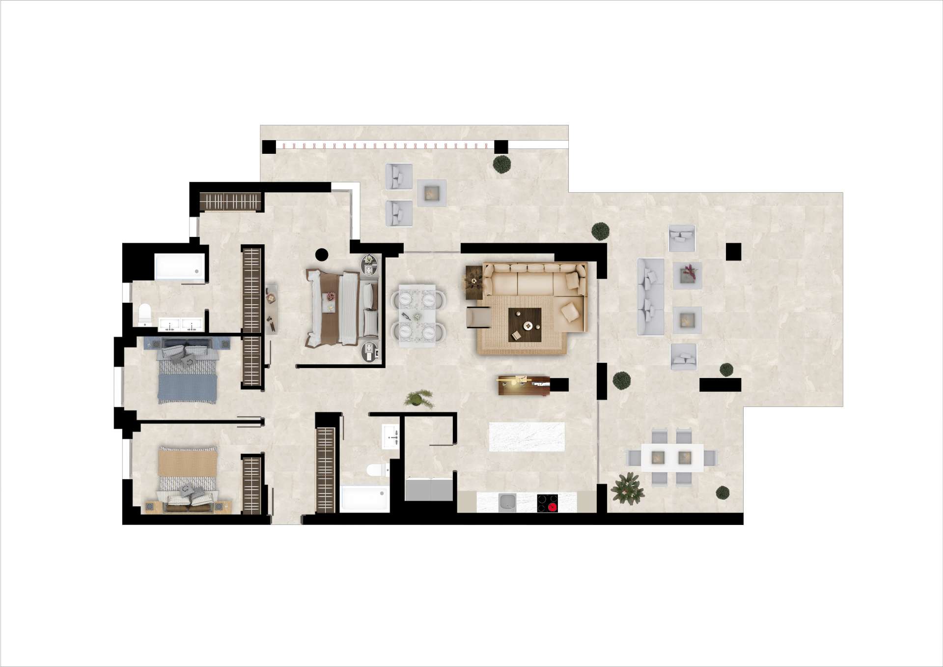 Интерьеры квартир разработаны таким образом, чтобы создать атмосферу комфорта и элегантности. В каждой квартире площадью 118 кв. м и 95 кв. м полезной площади есть просторные гостиные и светлая главная спальня с ванной комнатой, а также вторая ванная комната для двух других спален. Большие раздвижные двери объединяют террасы с жилыми помещениями, обеспечивая плавный переход между внутренним и внешним пространством. Квартиры поставляются полностью оборудованными, с высококачественными материалами и отделкой, а дизайн интерьера выполнен в средиземноморском стиле, который идеально дополняет престижное окружение, в котором они расположены.