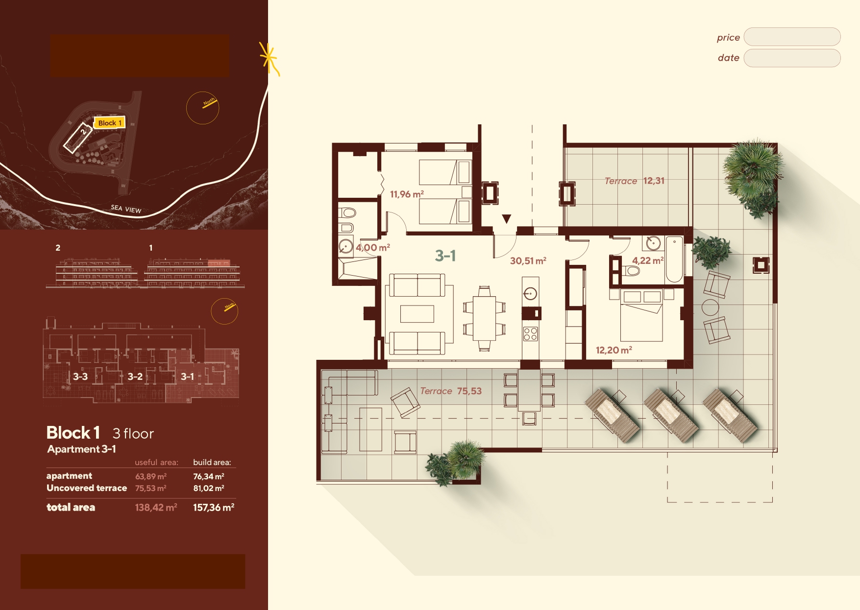Квартиры в комплексе спроектированы так, чтобы обеспечить максимальный комфорт и функциональность. Площадь квартир составляет 97 м², жилая площадь - 82 м², каждая квартира имеет просторные террасы площадью 132 м², с которых открывается захватывающий вид на море. Интерьеры включают три спальни с двуспальными кроватями и две полные ванные комнаты, открытые и хорошо освещенные пространства. В кухнях предварительно установлены кондиционеры, что позволяет жильцам обустраивать свои дома в соответствии со своими потребностями. Высококачественная отделка и современный дизайн создают уютную и стильную атмосферу, идеально подходящую для того, чтобы наслаждаться теплым климатом и естественным освещением круглый год.