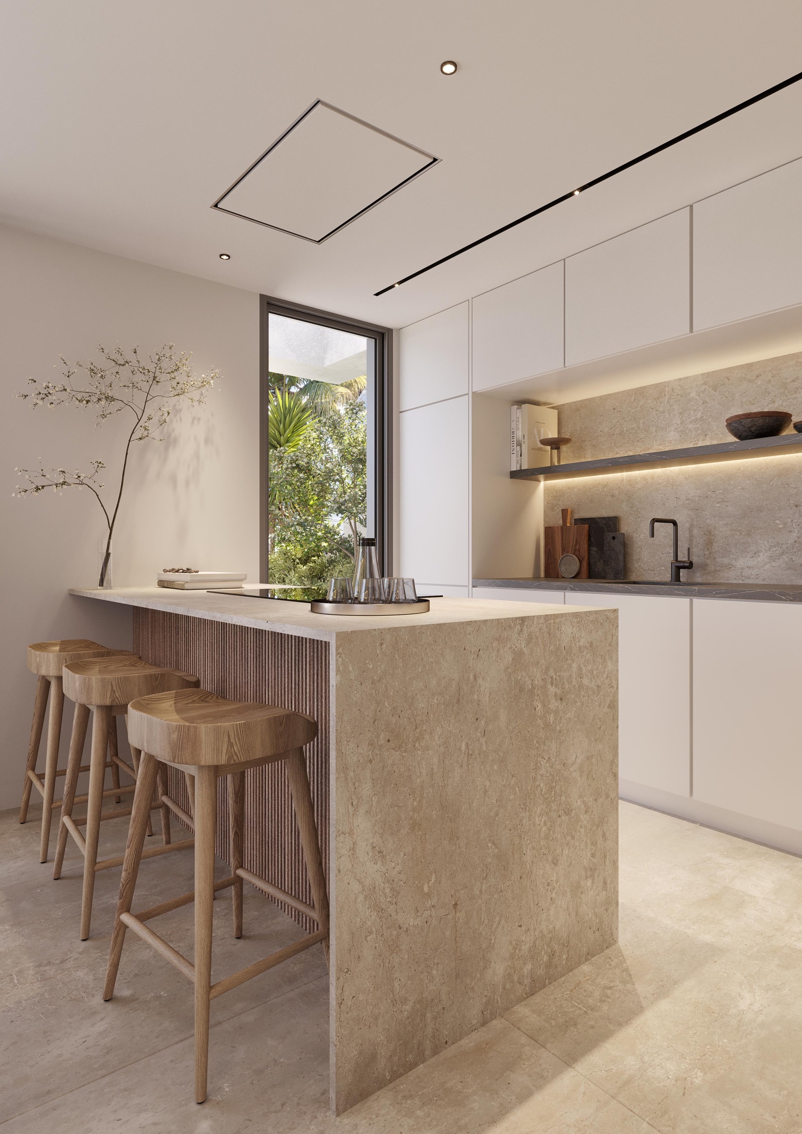 Квартиры излучают спокойствие и элегантность благодаря палитре нейтральных тонов, благородным материалам, таким как дерево и камень, и открытой планировке, которая приглашает вас дышать. Раздвижные стеклянные двери от пола до потолка позволяют интерьеру выходить на просторные террасы, размывая границы между зданием и природой. Здесь естественный свет является главным героем, а каждая комната располагает к отдыху и наслаждению.