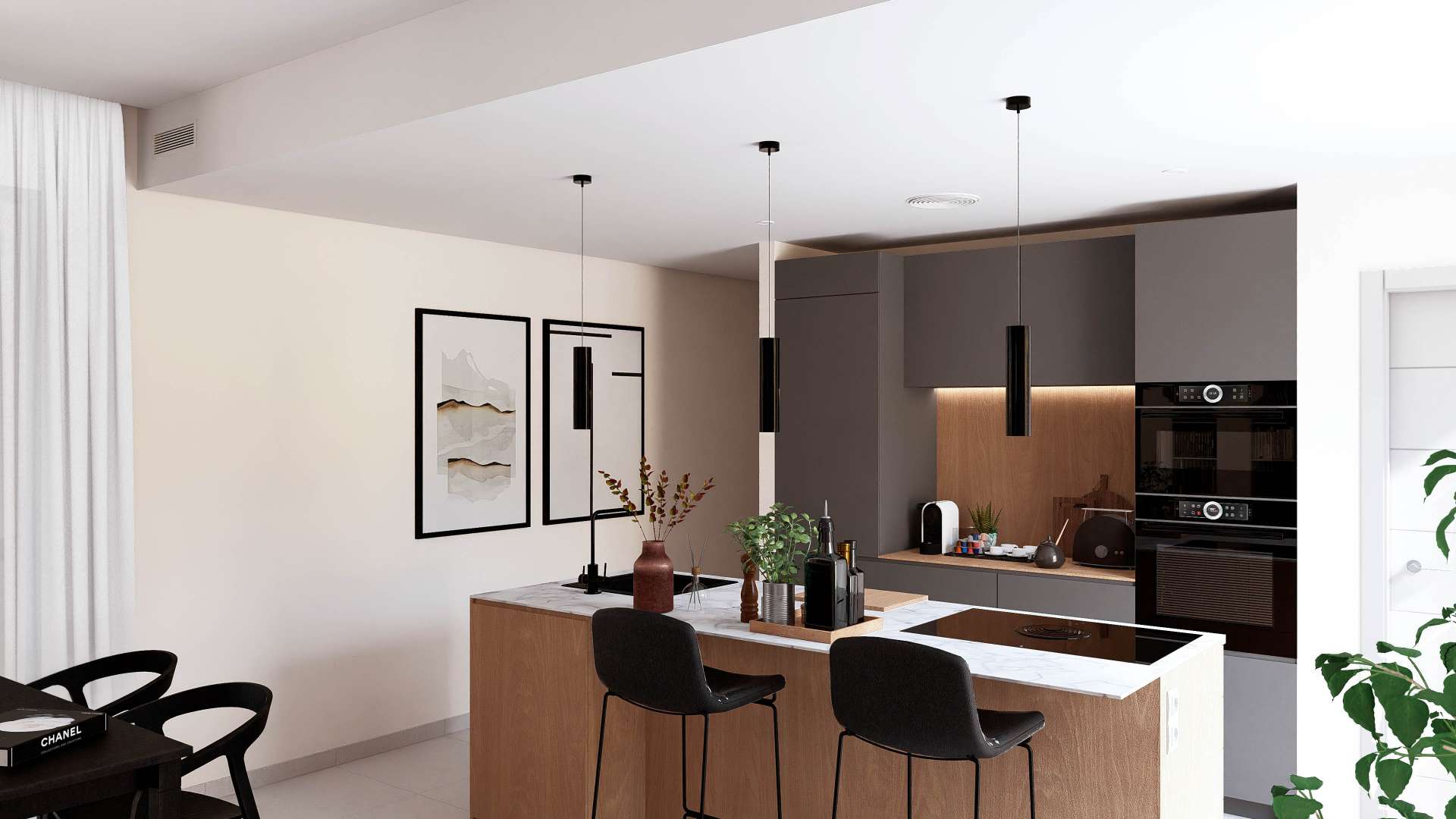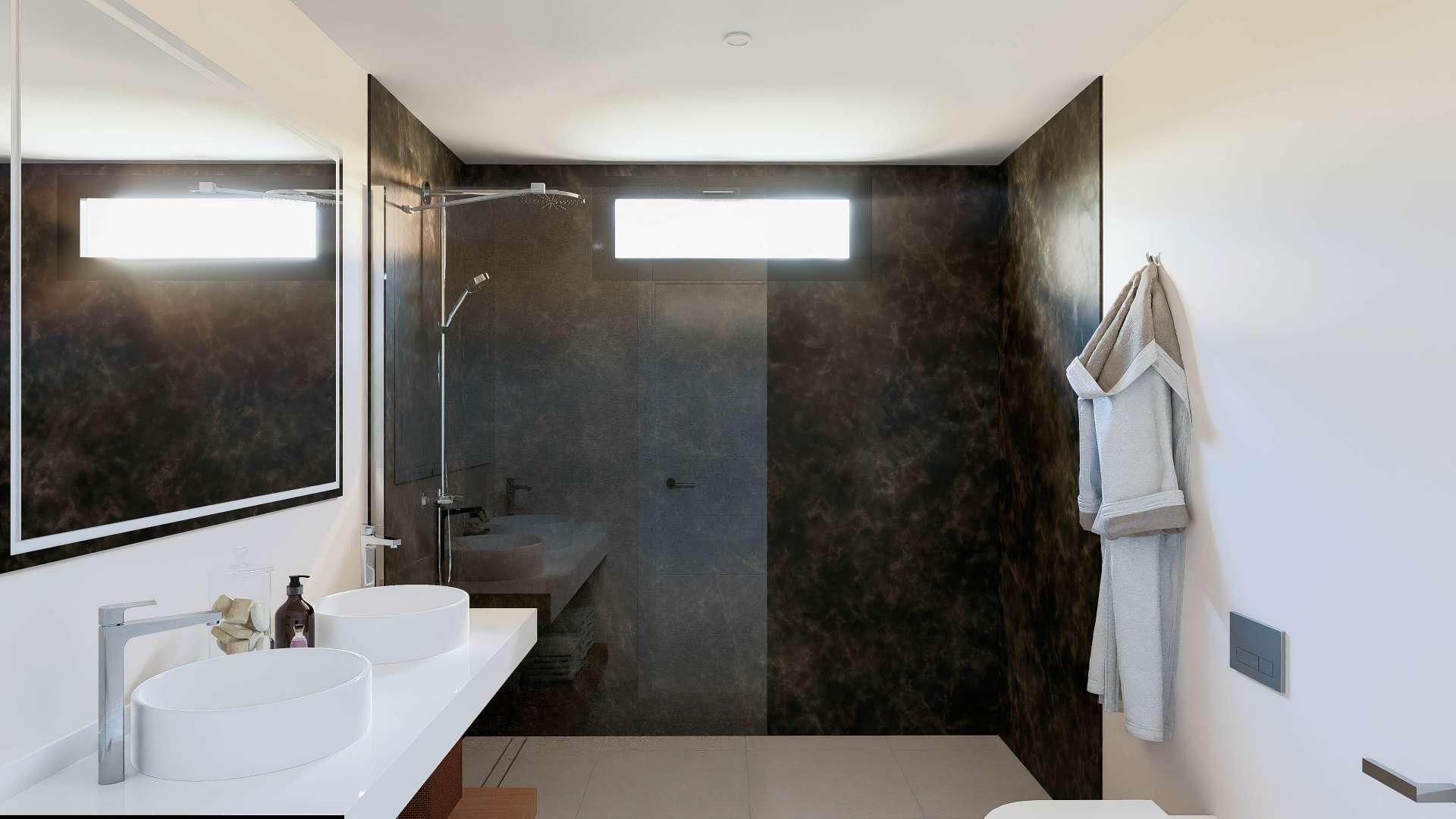 Interiören i dessa villor är utformad för att maximera det naturliga ljuset och erbjuda en mysig och funktionell atmosfär. Med en byggyta på 164 m² har fastigheterna 4 dubbelrum och 3 kompletta badrum. Det öppna köket integreras sömlöst med vardagsrummet och skapar ett rymligt och ljust utrymme som är idealiskt för familjeliv och underhållning. Rummen är fördelade på ett sådant sätt att de maximerar komfort och integritet, med högkvalitativa material och moderna ytbehandlingar som garanterar ett bekvämt och effektivt hem.
