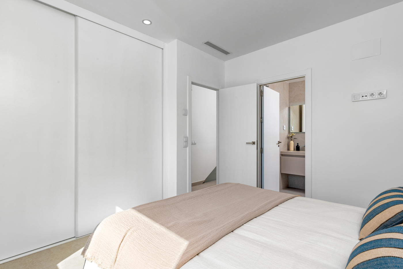Villornas interiör är utformad för att erbjuda maximal komfort och funktionalitet. På bottenvåningen finns ett ljust vardagsrum med matsal med stora fönster som kommunicerar direkt med trädgården och poolen, vilket skapar ett öppet och välkomnande utrymme. Det moderna köket är integrerat i vardagsrummet, utrustat med högkvalitativa apparater och moderna ytbehandlingar. På denna våning finns också ett sovrum med dubbelsäng och ett komplett badrum, perfekt för gäster eller som ett extra sovrum. På första våningen finns två dubbelrum, alla med eget badrum, vilket ger integritet och komfort för de boende. Ett fantastiskt solarium på takvåningen kompletterar ensemblen och erbjuder ett perfekt utrymme för att njuta av lugna stunder och panoramautsikt.