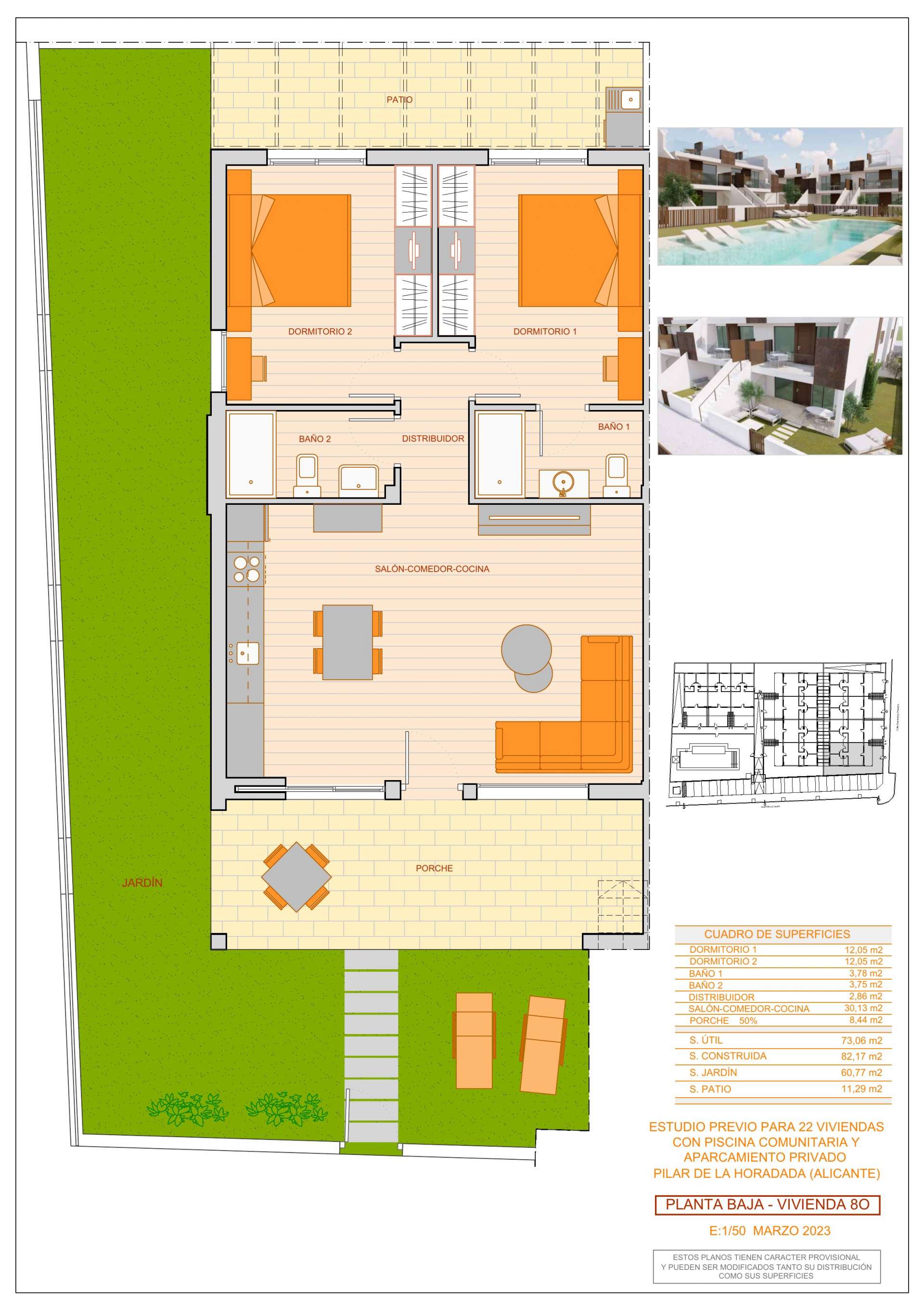 Detta exklusiva bostadsområde erbjuder en oöverträffad livsstil med sina 22 förstklassiga bostäder och högkvalitativa ytbehandlingar från det välkända varumärket PORCELANOSA. Varje hem har 2 sovrum och 2 badrum, tillsammans med ett rymligt vardagsrum-kök. Lägenheterna på bottenvåningen har stora trädgårdar med konstgräs, medan lägenheterna på översta våningen har en terrass och ett solarium som är perfekt för att njuta av solen året runt. Dessutom kan du koppla av i det gemensamma området med en pool och en bekväm parkeringsplats.