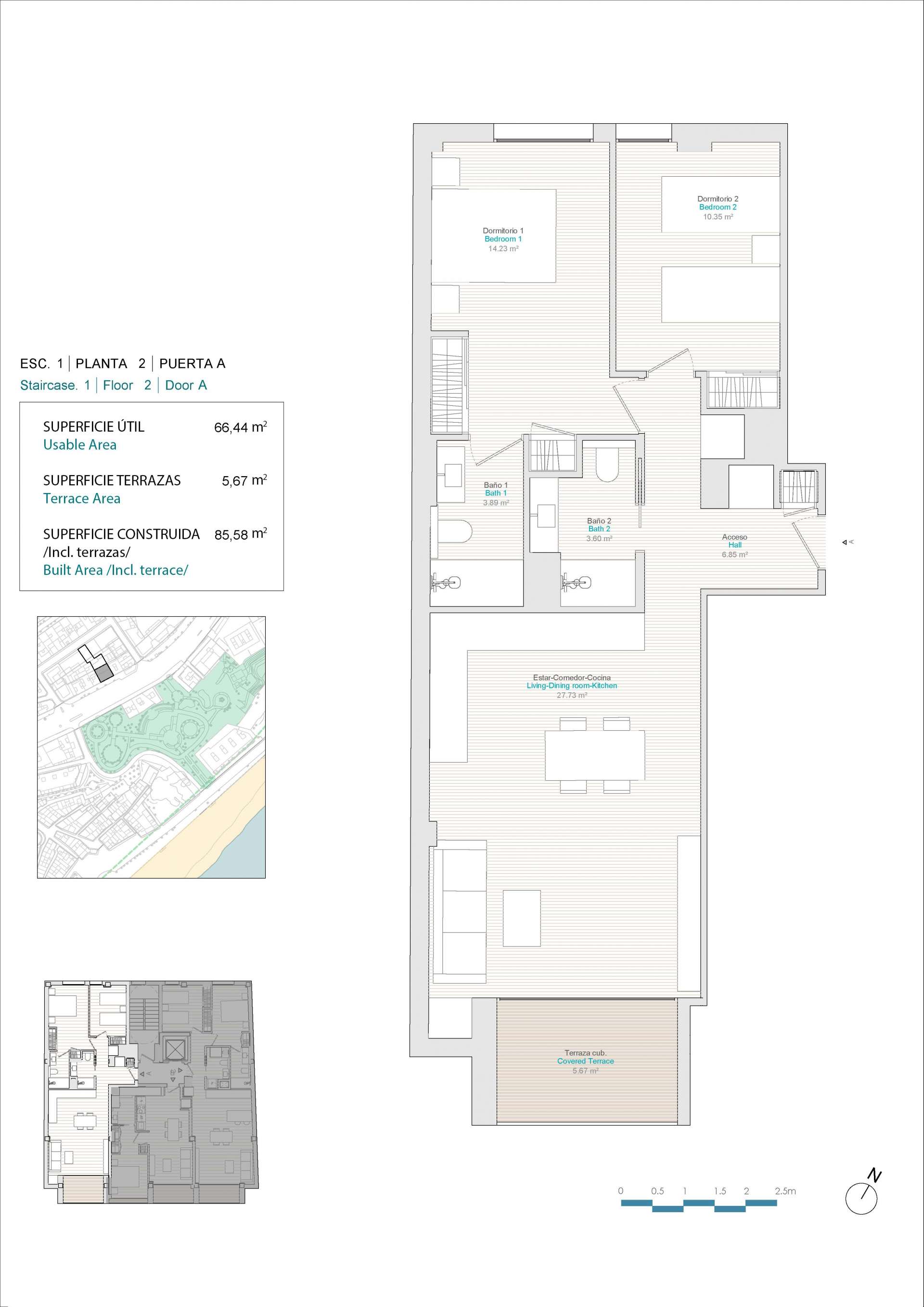 Interiören är utformad för att maximera komfort och funktionalitet, med rymliga rum som tar tillvara det naturliga ljuset på bästa sätt. Bostäderna har fullt utrustade kök och badrum med material av högsta kvalitet, effektiv aerotermisk luftkonditionering och värmeisolering för ökat välbefinnande. Varje detalj har utformats för att ge en modern och välkomnande atmosfär, perfekt för både avkoppling och vardagsliv.