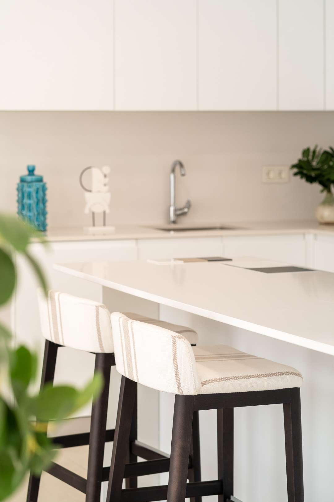 Interiören har noggrant utformats för att erbjuda rymliga och ljusa utrymmen, där funktionalitet och komfort är en prioritet. Bostäderna har ett "open space"-koncept som sömlöst förbinder vardagsrummet med det öppna köket och terrassen, vilket skapar en idealisk miljö för att njuta av utomhuslivet. Materialen som används är av högsta kvalitet, inklusive golv av porslinsstengods, kök utrustade med vitvaror av högsta märke och aerotermiska luftkonditioneringssystem. Varje detalj, från planlösningen till ytskikten, har genomtänkts för att maximera de boendes komfort och livskvalitet.