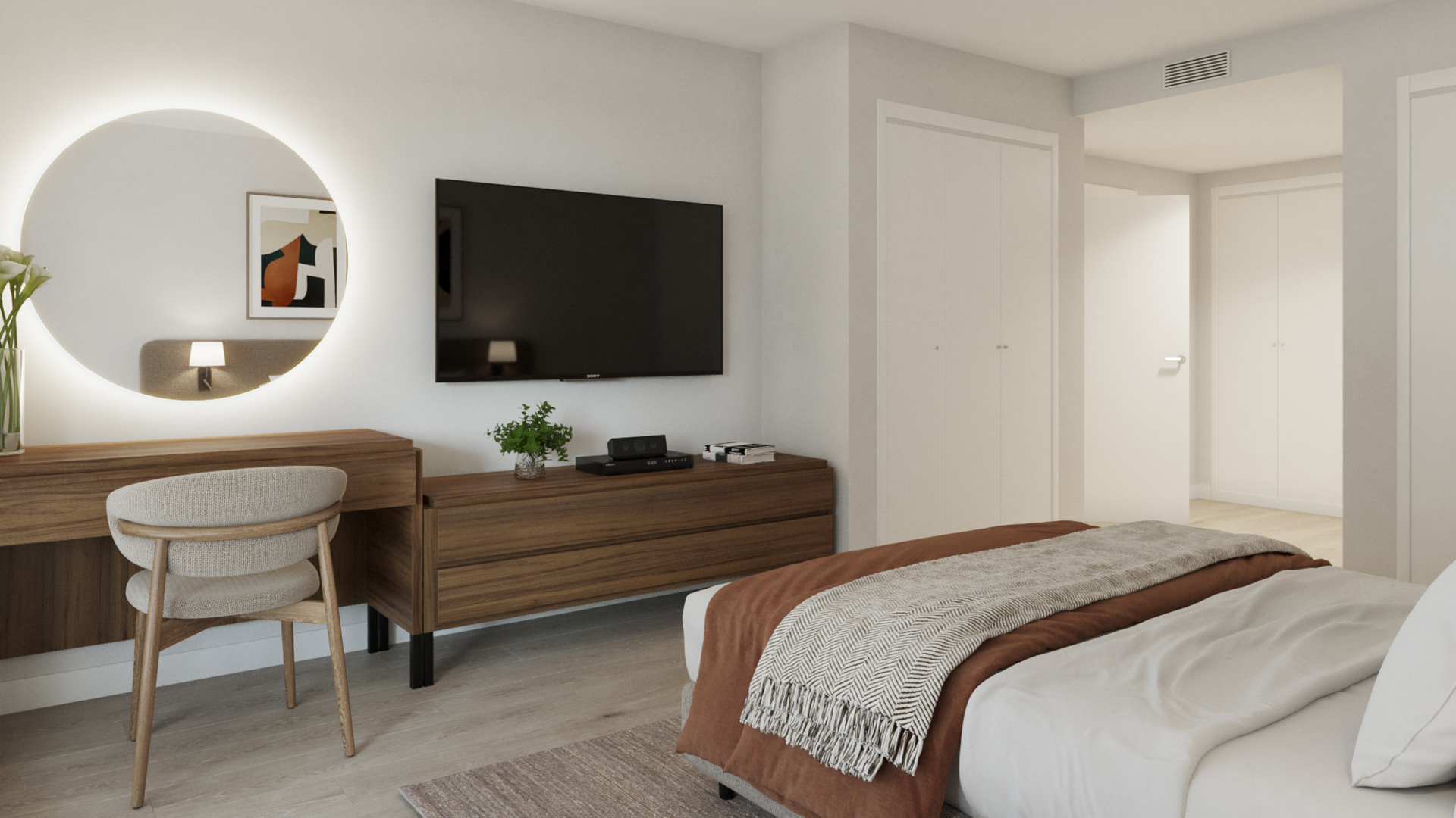 Varje hem har utformats för att ge en överlägsen boendeupplevelse, med fokus på funktionalitet och komfort. Vardagsrummet, matsalen och köket ligger i en öppen planlösning, vilket skapar en rymlig miljö som ansluter direkt till terrassen. De stora fönstren släpper in naturligt ljus och skapar en ljus och välkomnande atmosfär. Köket har modern design och är fullt utrustat med avancerade vitvaror. Inredningen är omsorgsfullt designad, med kvalitetsfinish och en effektiv layout som optimerar användningen av utrymmet. Vardagsrummet kännetecknas av stora fönster som erbjuder spektakulär utsikt och direkt anslutning till terrassen. Golvet är belagt med trägolv, vilket ger värme och komfort till atmosfären. Matsalen, som är integrerad i detta öppna utrymme, erbjuder en idealisk plats att dela stunder med familj eller vänner, och sovrummen är utformade med maximal komfort i åtanke. Alla har stora fönster, så att du kan njuta av utsikten och det naturliga ljuset, med en elegant design med en modern och funktionell touch.