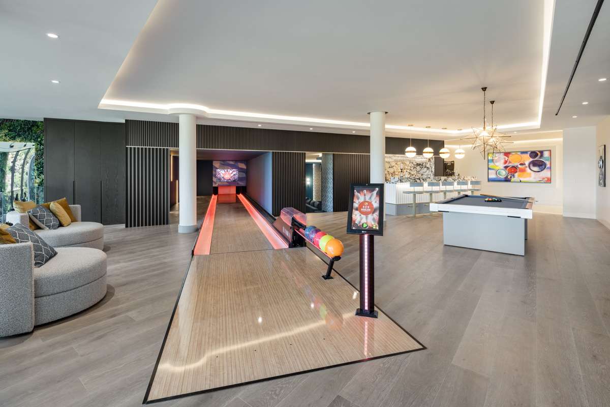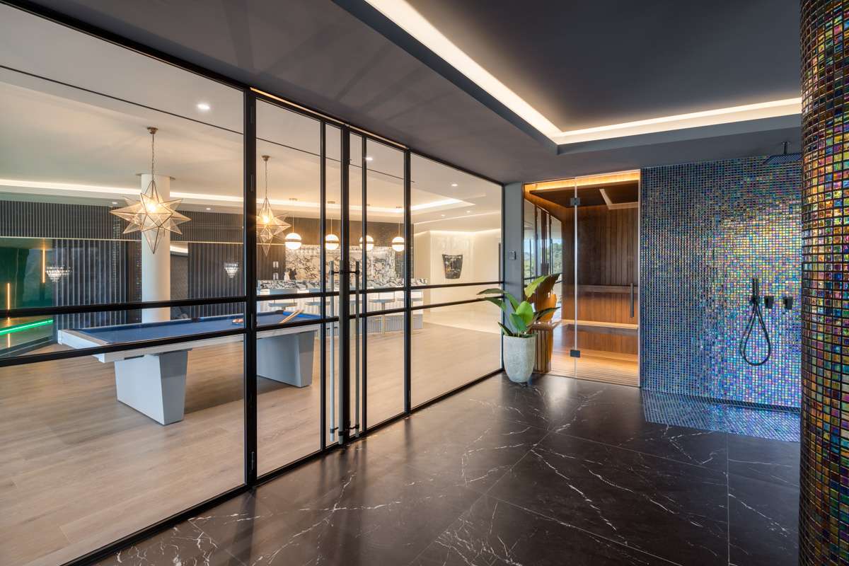 Redan från entrén imponerar villan med dubbla takhöjder, stora fönster och en öppen planlösning som framhäver rymligheten. Gourmetköket är utrustat med den senaste tekniken och unika detaljer som integrerade utomhusvattenkällor. Det stora badrummet, designat av en känd modedesigner, är ett funktionellt konstverk. Förutom sina nio rum med egna badrum har huset ett spelrum med privat bowlinghall, en biograf, gym, spa och flera underhållningsutrymmen som höjer boendeupplevelsen till resortnivå.